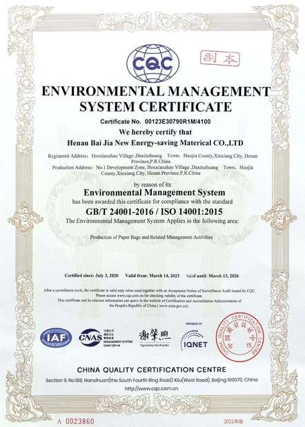 มาตรฐาน:ISO9001 หมายเลข:00120Q34488R2M/4100 วันที่ออก:2023-03-10 วันหมดอายุ:2026-03-12 ขอบเขต/ระยะ:Prodution of paper bags ออกโดย:CHINA QUALITY CERTIFICATION CENTER |
