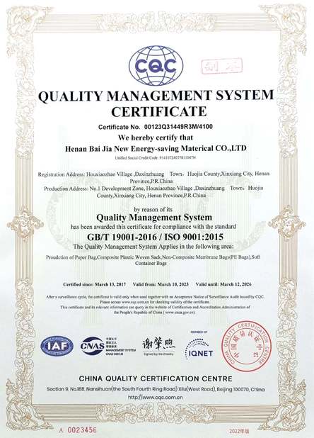 มาตรฐาน:Business license หมายเลข:91410724077811047N วันที่ออก:2013-08-21 วันหมดอายุ:2023-08-20 ขอบเขต/ระยะ:Paper bags,woven bags ออกโดย:Administration for Industry and Commerce |